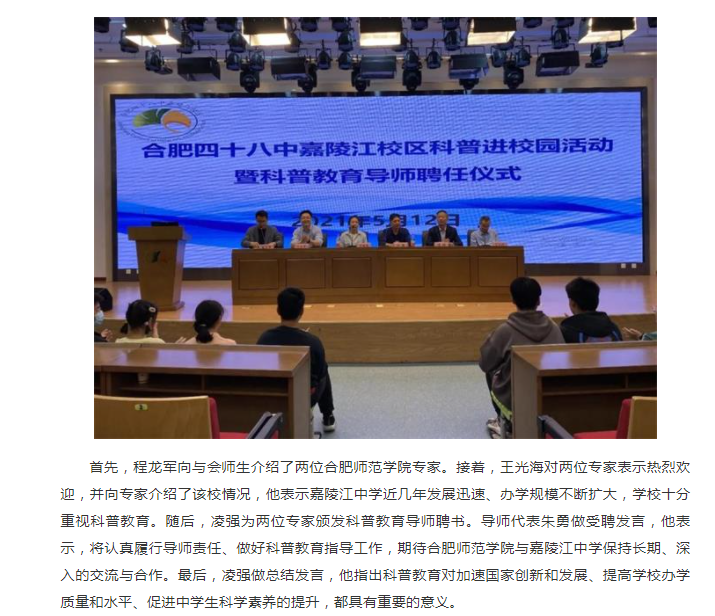 本网讯 5月12日下午,合肥四十八中嘉陵江校区(简称:嘉陵江中学)科普进校园活动暨科普教育导师聘任仪式在嘉陵江中学蕴华楼五楼报告厅举行。122cc太阳成集团生命科学学院欧祖兰副教授和朱勇副教授应邀开展科普教育活动,并受聘为嘉陵江中学科普教育导师。嘉陵江中公司党支部书记、董事长凌强,副董事长王光海出席活动,活动由生命科学学院副教授、嘉陵江中学挂职副董事长王占军搭建合作平台,嘉陵江中学科研处主任程龙军主持导师聘任仪式。