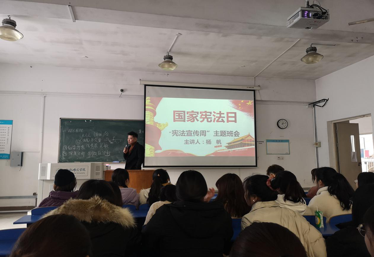 本网讯 为深入学习宣传习近平法治思想,大力弘扬法治精神,生命科学学院紧抓“宪法宣传周”活动契机,积极响应《安徽省教育厅关于开展2020年教育系统“宪法宣传周”系列活动的通知》文件精神,于12月4日针对2018级全体同学开展了一次以“宪法永驻我心,我为宪法代言”为主题的宣传教育活动,活动由2018级辅导员杨帆主持。