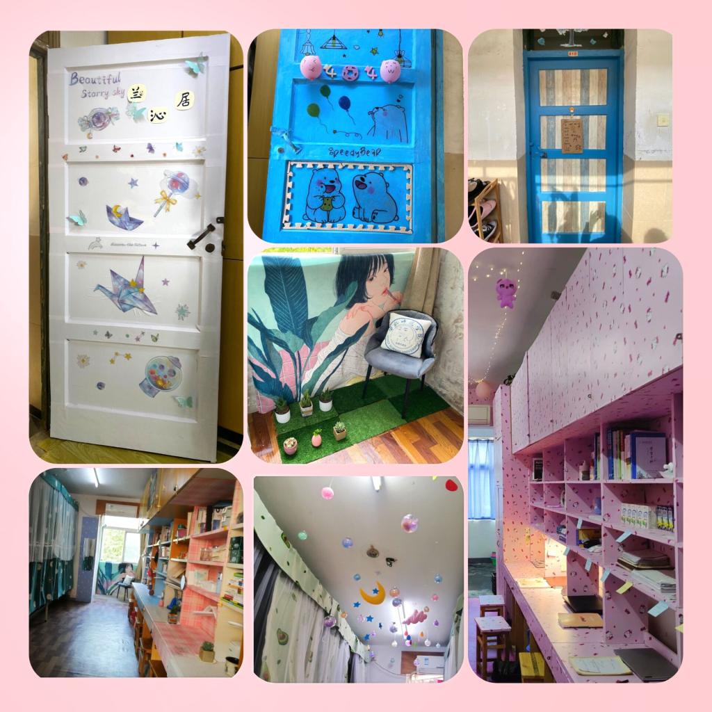 其中7栋418的“温馨小屋”,用粉色做为主色调装扮了整个寝室,气氛温馨,装饰独特。贴在墙上的标语“终日乾乾 与时偕行”勉励着寝室同学要谨慎做事,自强不息,和日月一起运转,永不停止。而墙顶的夜灯则像繁星一样灿烂,照亮了大家心窝也照亮了大家的未来。