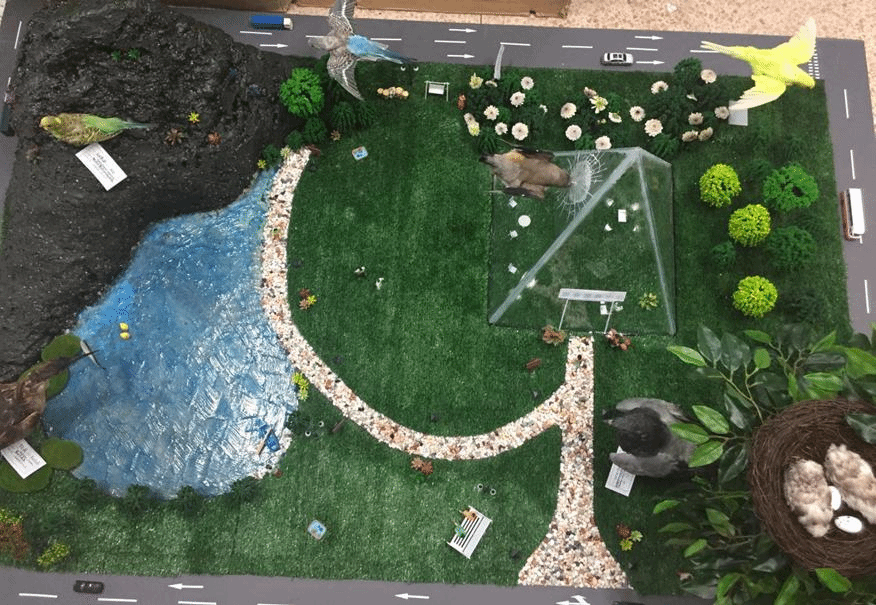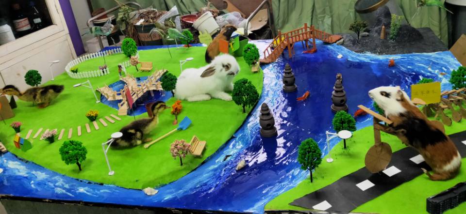 顾雨欣等同学的《三谭印月》和李寅贤等同学的《飞鸟之殇》荣获本次大赛二等奖。这两幅作品都采用了完整的动植物标本,成立体图像,使所要表达的内容更生动形象,体现了生态平衡的意象,寓意着人与自然和谐共生。