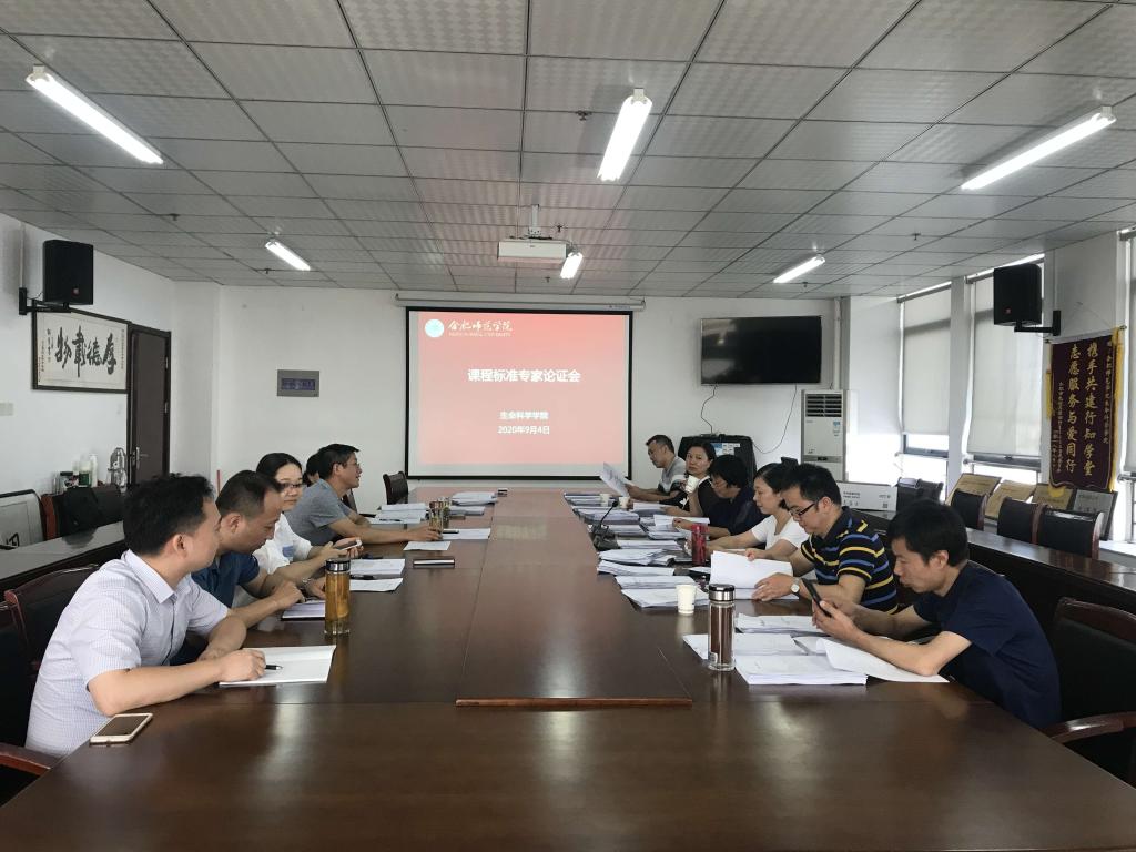 本网讯 9月4日上午,生命科学学院在行知楼1502进行了2020版本科课程标准的论证工作,邀请了安徽农业大学教授蔡永萍,合肥工业大学教授汪惠丽,食品行业协会秘书长邵栋梁,安徽省农业科学院植物保护与农产品质量安全研究所研究室主任段劲生,合肥市九中教师雕玲,安徽九方药物研究院实验室主任牛海军担任论证专家,该院经理徐忠东,副经理朱桂兰及专业负责人参加了此次论证会。
