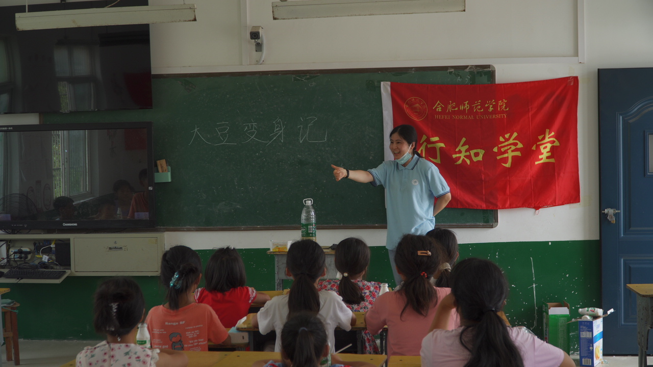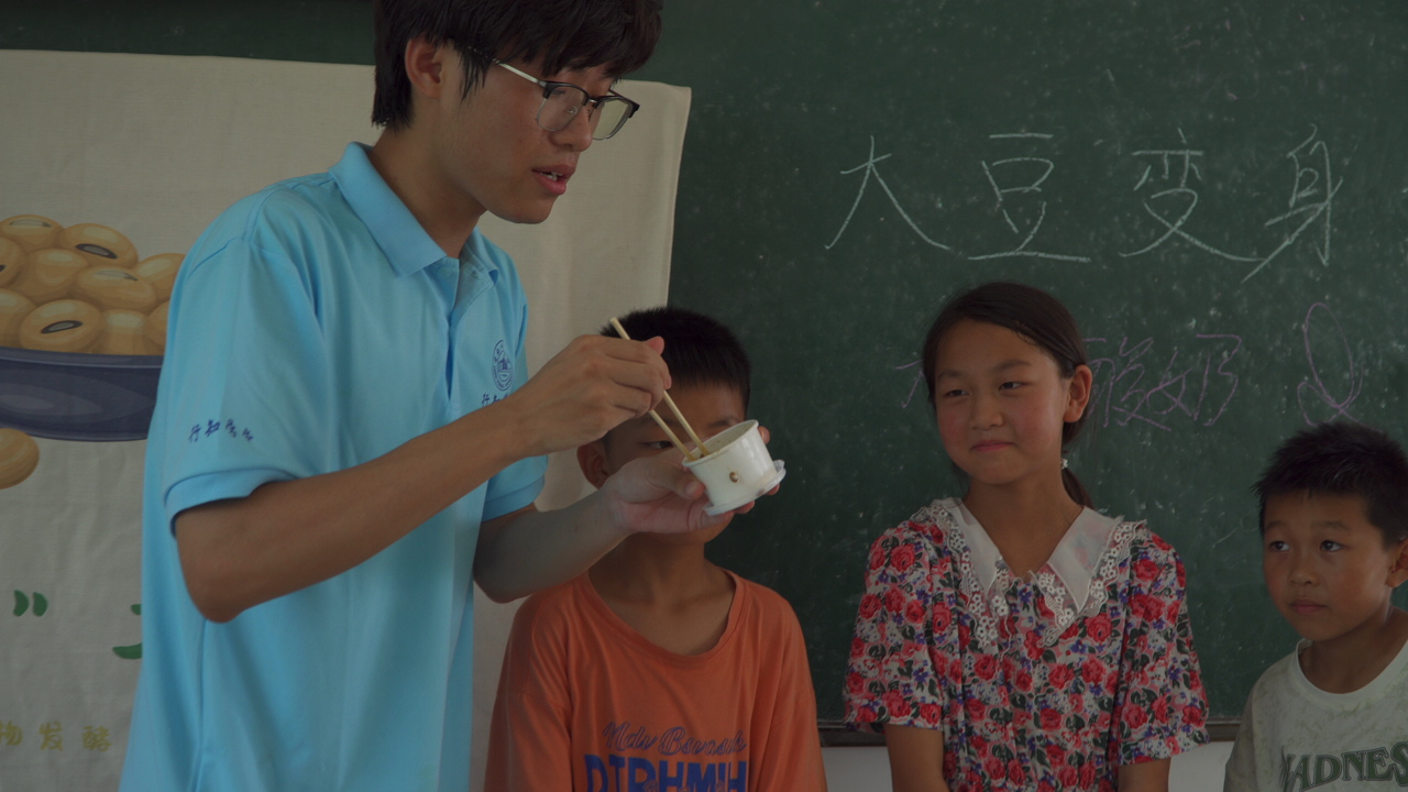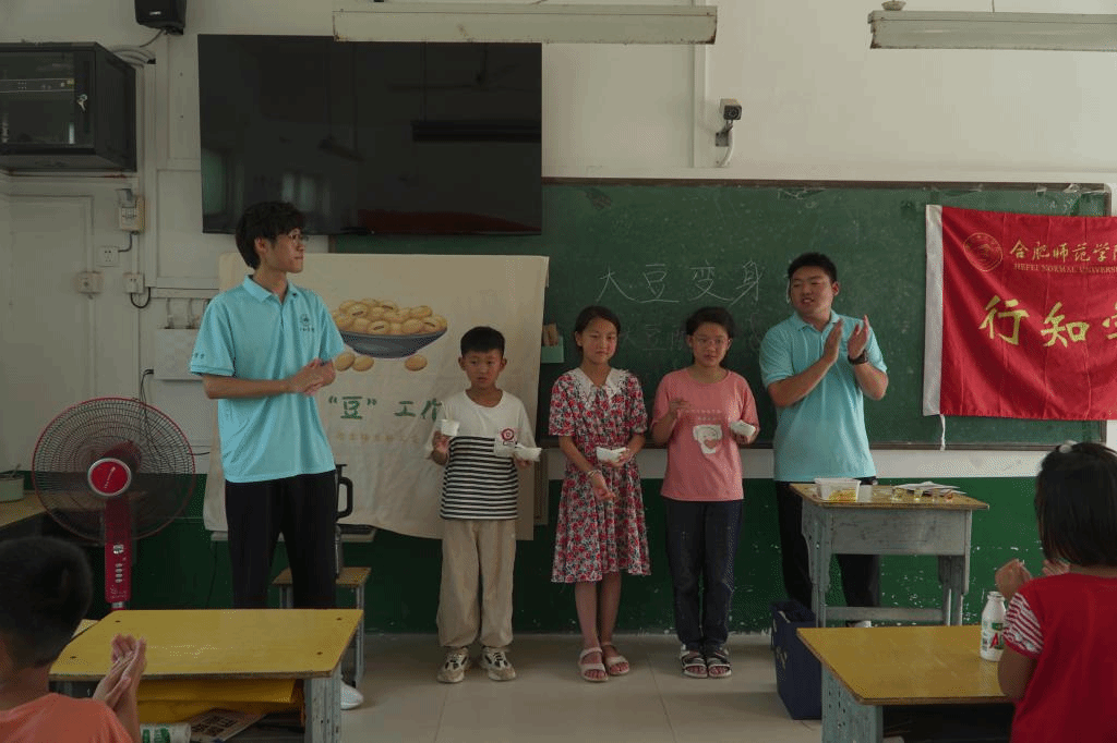 乡村振兴,教育先行。要达成农业强、农村美、农民富的美好乡村图景,教育起到重要的支撑作用。为激发少年儿童对微生物科学的兴趣,提高科学素质,激发创新思维,实践团队以颍东区口孜镇王庄村行知学堂为依托,给当地农村留守儿童带来了一堂“‘大豆变身记’——植物基酸奶科普小课堂”,并开展了“大豆磨磨乐”、‘酵‘醒’大豆一日游”、“比比谁的拉丝长”三项趣味活动。