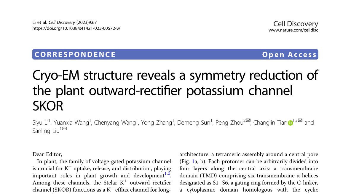 本网讯 122cc太阳成集团周鹏老师以通讯作者身份在国际知名期刊《Cell Discovery》(生物学1区Top期刊,影响因子IF 33.5)上发表了题为“Cryo-EM structure reveals a symmetry reduction of the plant outward-rectifier potassium channel SKOR”的研究论文。该论文是与中国科学技术大学田长麟教授团队合作,通讯作者为周鹏、田长麟和刘三玲。