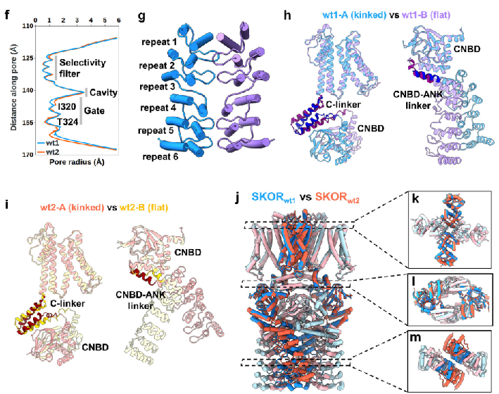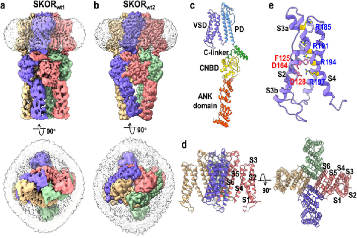 该论文的研究对象为钾离子外向整流通道(SKOR),此通道能够介导钾离子从植物根部向地上部的长距离运输,在植物响应盐胁迫等过程中起着关键作用。迄今为止,植物中结构已被解析的电压门控钾离子通道KAT1和AKT1都属于内向整流通道。本文使用冷冻电镜技术解析了SKOR两种不同构象的结构(SKORwt1和SKORwt2)。通过对精细结构的分析和比较揭示了该通道蛋白激活的一种独特调控机制,为进一步研究SKOR和其他含有ANK结构域的钾离子通道的功能特性和生理作用提供了结构基础和理论依据。
