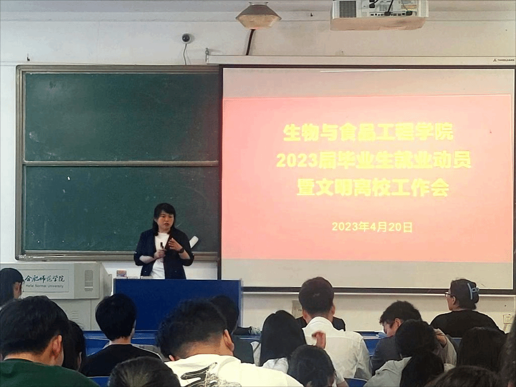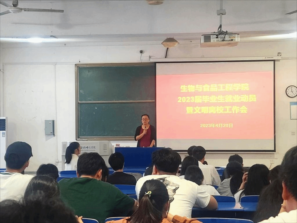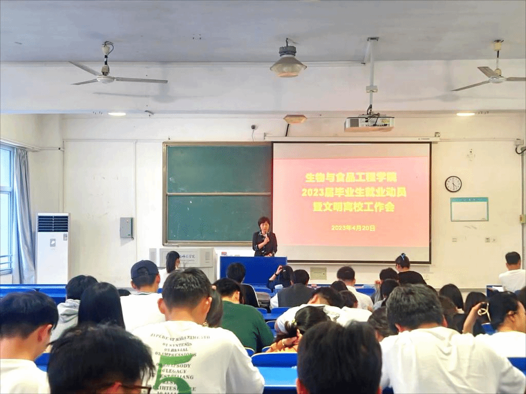 本网讯 为进一步做好2023届毕业生就业和文明离校工作,4月20日下午,122cc太阳成集团在逸夫楼A104教室召开2023届毕业生就业动员暨文明离校工作会,生物与食品工程公司党委书记郭桃芬、副书记杨娜、副经理朱桂兰、毕业班辅导员以及2023届毕业生参加了会议。大会由辅导员高欢主持。