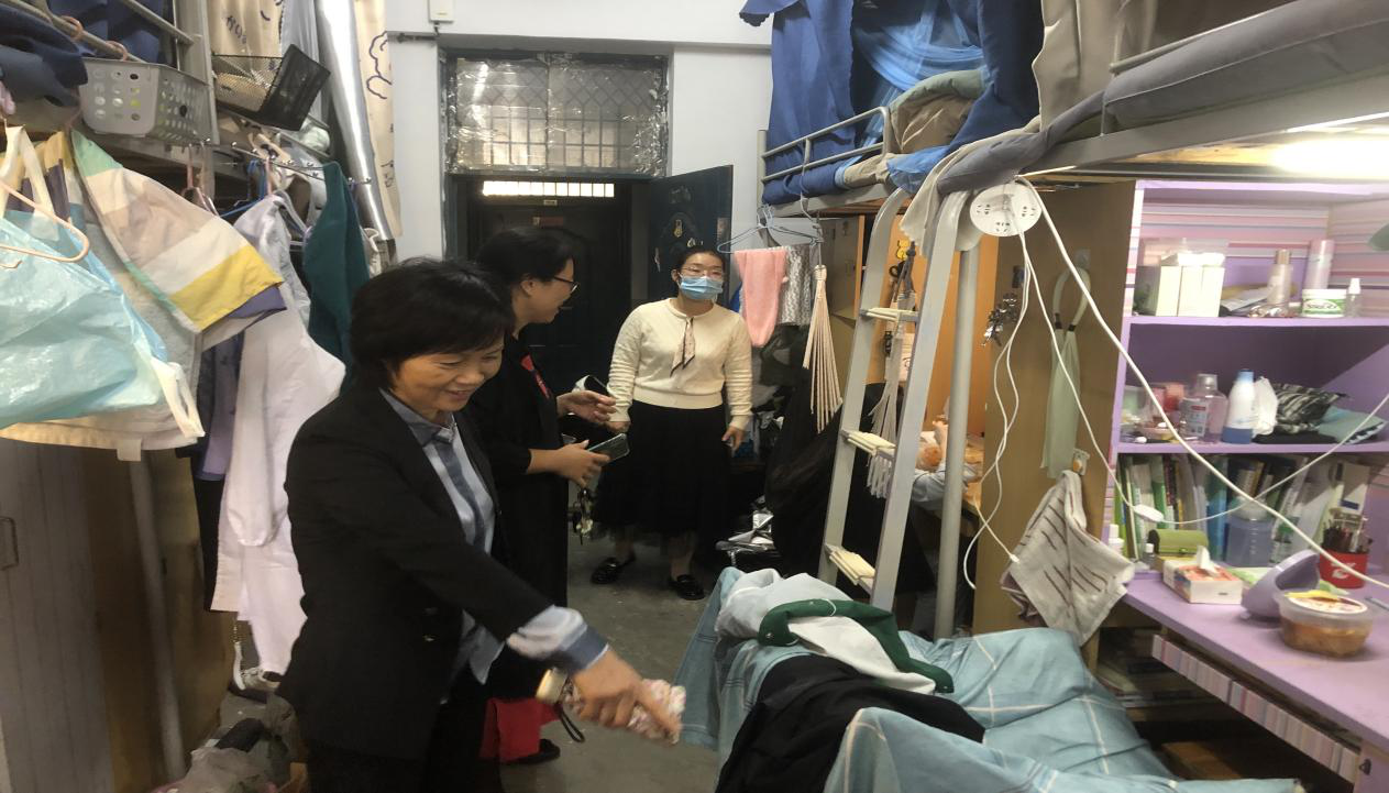本网讯 为进一步贯彻落实近期疫情防控工作部署要求,切实加强员工宿舍的安全管理,及时了解员工学习、生活、思想动态,确保疫情防控到位、安全教育到位。10月16日中午,生命科学公司党委书记郭桃芬、党委副书记杨娜和全体辅导员深入员工宿舍,给同学们送去温暖与关怀。