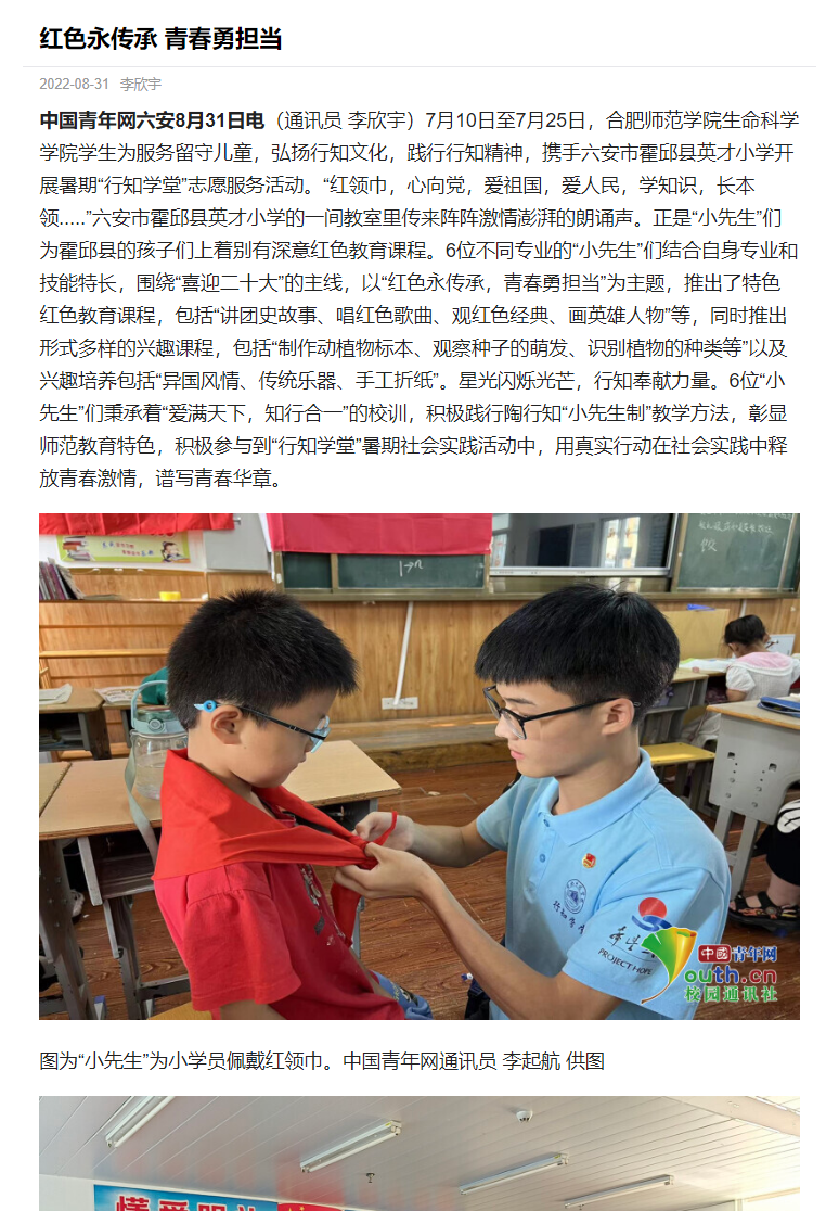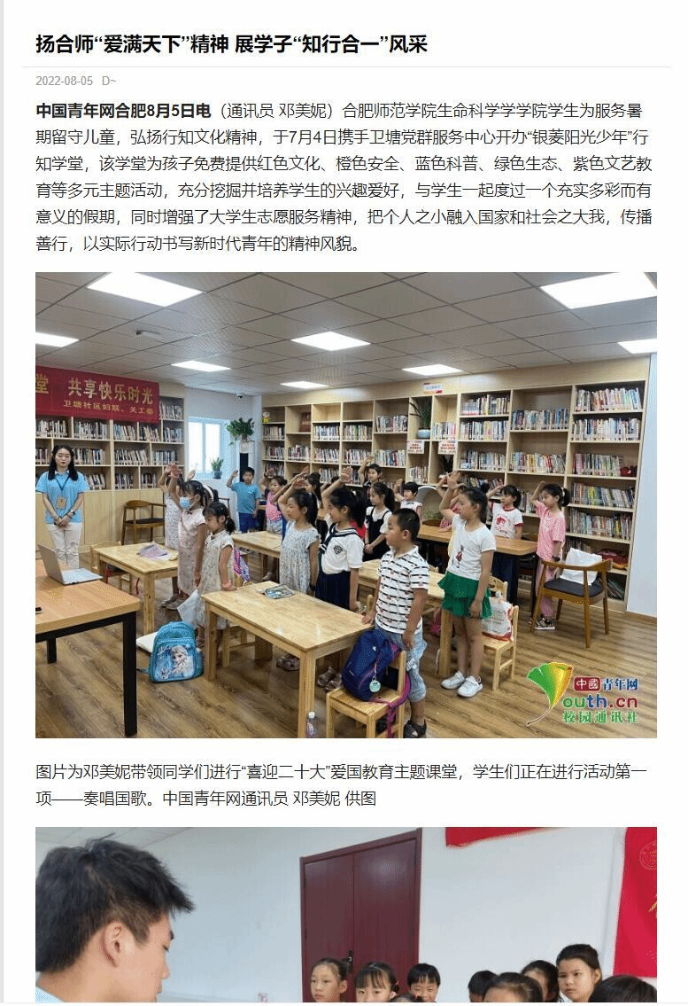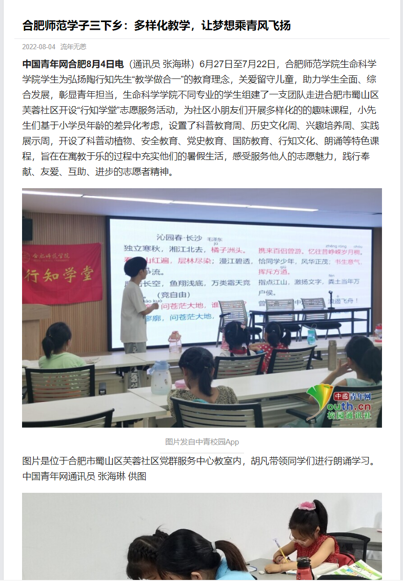 本网讯 为进一步发扬行知精神,弘扬行知文化,培养当代老员工社会责任感,生命科学学院积极动员员工参加“行知学堂”暑期实践活动,员工热情高涨。三个团队受到了《中国青年网》媒体的报道,其中包括卫塘社区“银菱阳光少年”行知学堂、合肥市蜀山区芙蓉社区行知学堂、六安霍邱县行知学堂。