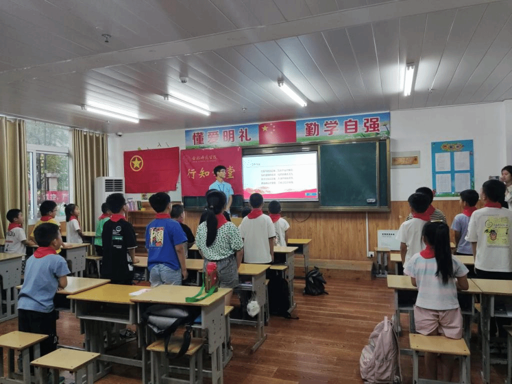 郭桃芬一行到达行知学堂时,生命科学学院20级生物技术专业的党员小先生李起航正在为小学员进行一场“红色永传承,青春勇担当”的红色主题教学,课堂中以战争年代霍邱县涌现出的革命烈士和英雄人物为主线,引导小学员们传承红色基因,增强爱党爱国爱家乡的荣誉感和自豪感。