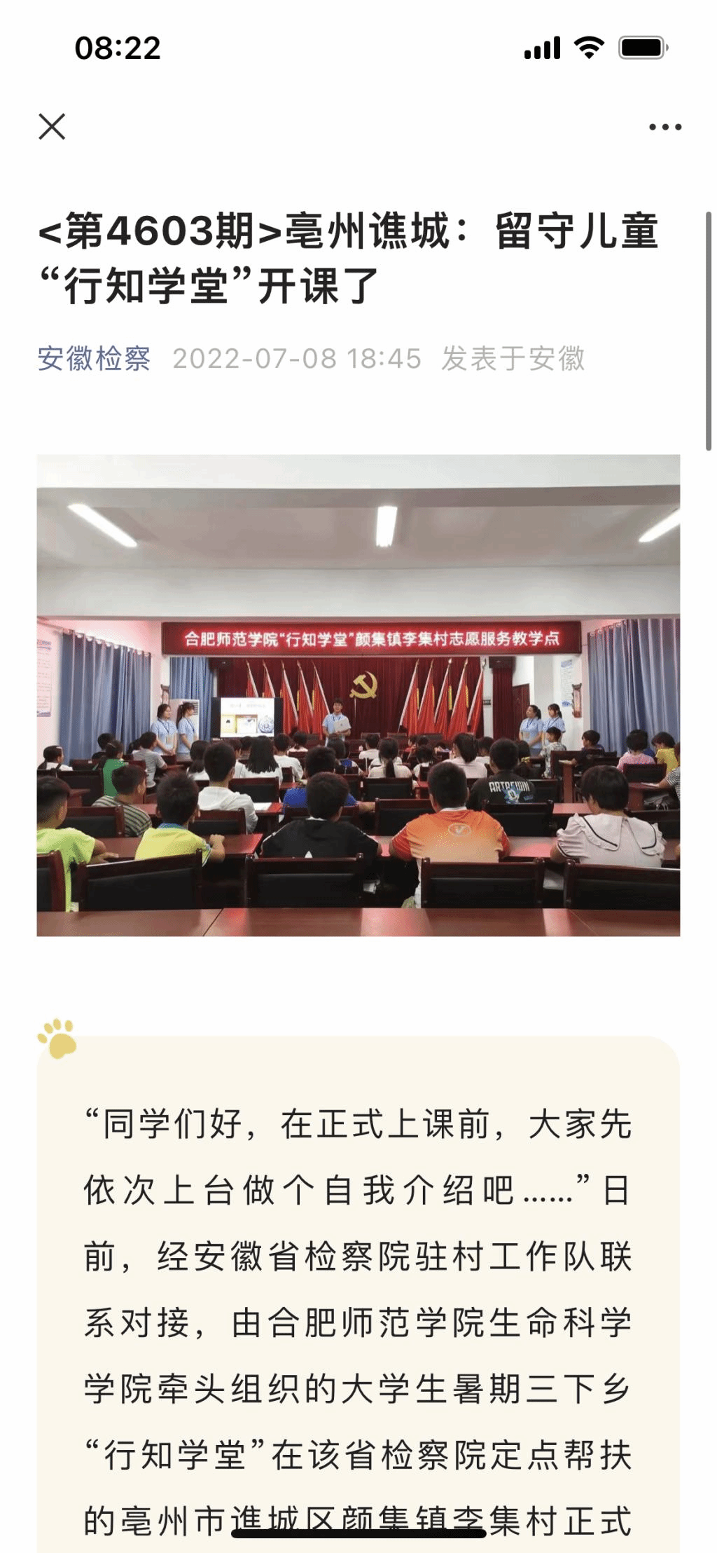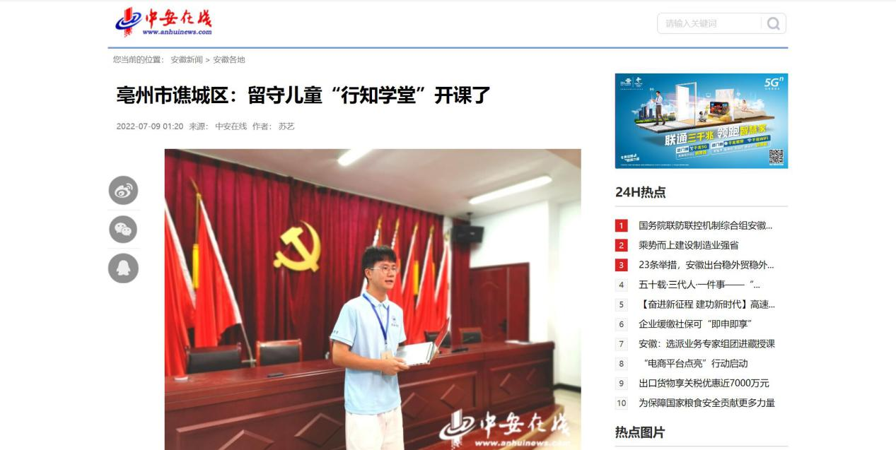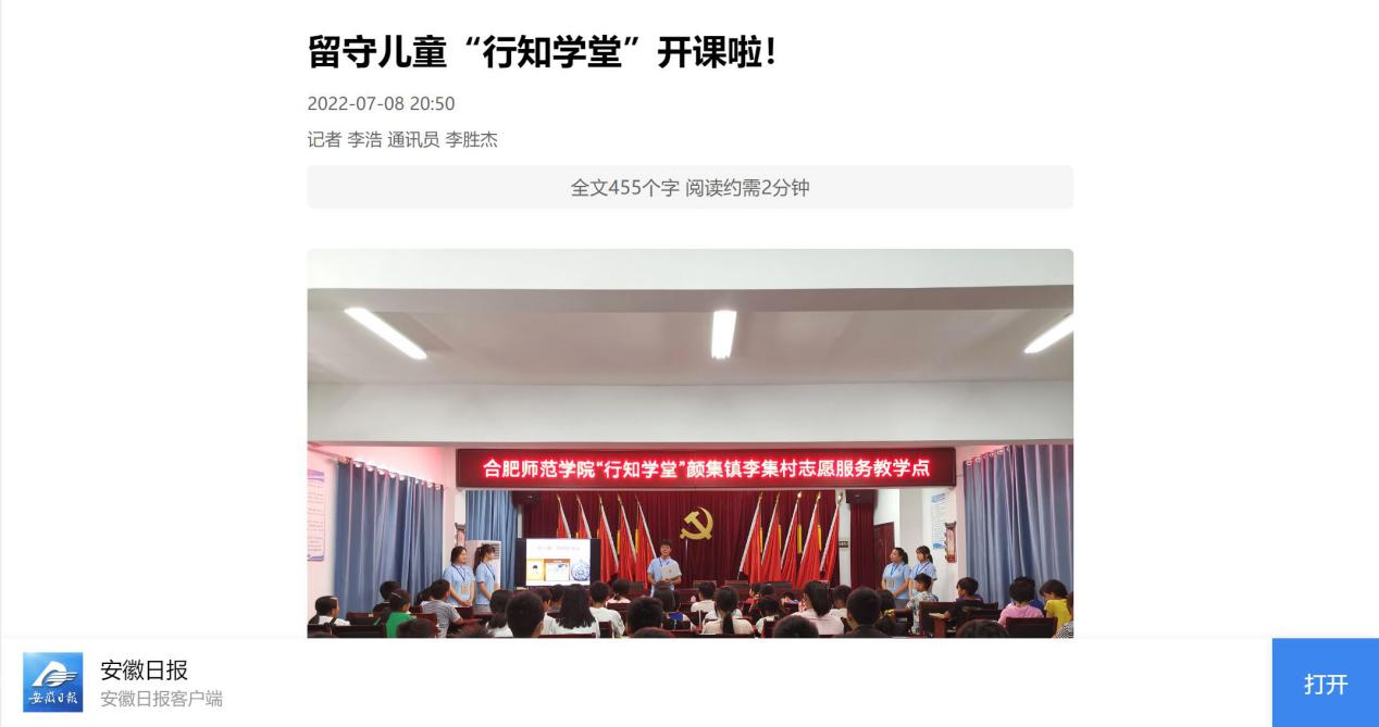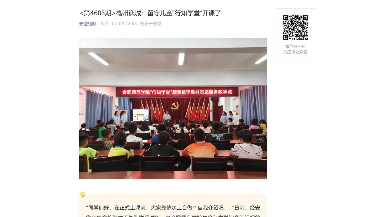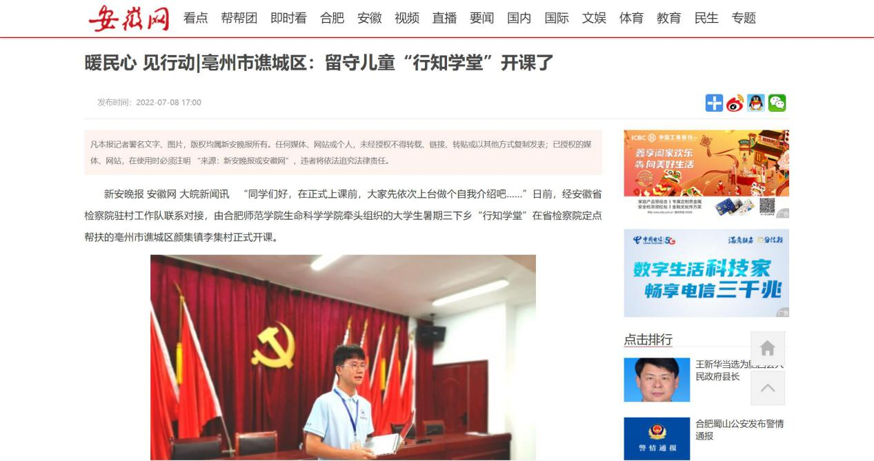 本网讯近日,生命科学学院牵头举办的亳州市谯城区开办的“颜集行知学堂”成功开班,引起了社会各大媒体的广泛关注。《安徽日报》、《新安晚报》、《中安在线》等多个媒体对此进行报道,安徽省人民检察院官方微信公众号转载报道。