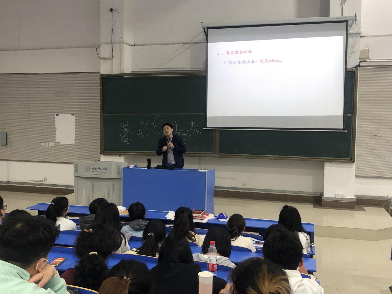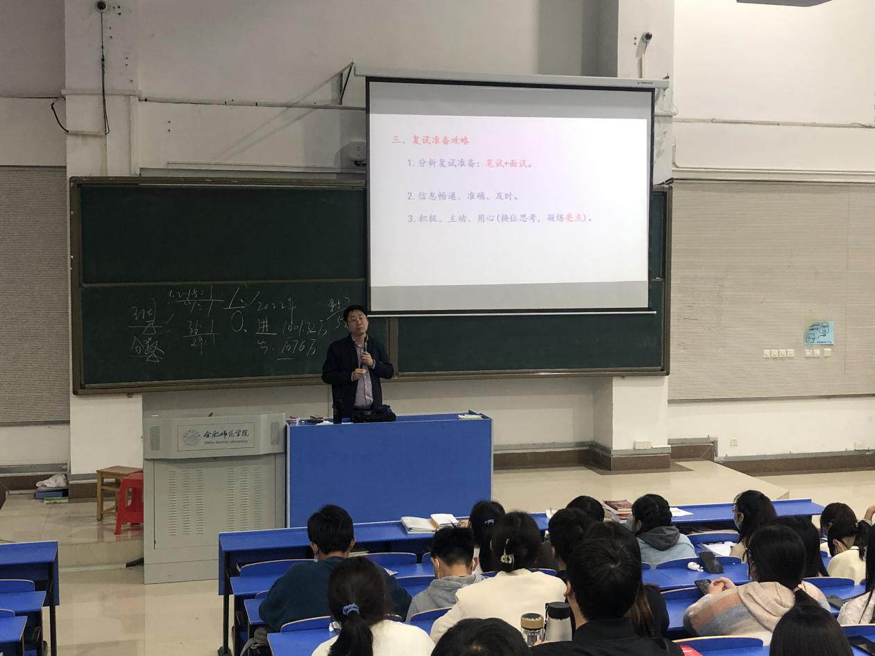 本网讯 随着2022年考研国家线的公布,研究生入学考试复试正式开启。为进一步推进学院毕业生升学工作,积极落实为师生办实事的实践要求,2022年3月14日下午,在逸夫楼西阶一教室开展考研复试与调剂的专题指导。本次指导交流会由生命科学学院副教授王占军老师担任主讲,由2018级辅导员杨帆主持。