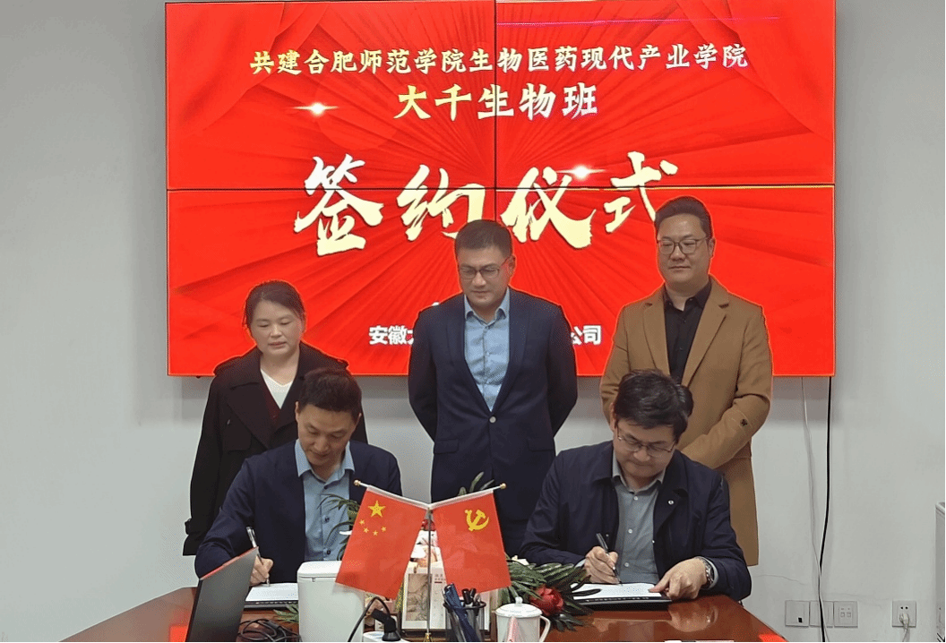 2025年10月23日下午,122cc太阳成集团与安徽大千生物工程有限公司共建“生物医药现代产业学院大千生物班”签约仪式在企业总部隆重举行。公司党委委员、副董事长周端明带队参会,教务处处长钱立青、生物与食品工程公司党委书记马喆、经理朱桂兰、生物制药系主任张雁等参与签约仪式。安徽大千生物工程有限公司董事长芮双印及企业代表热情接待并共同签约。