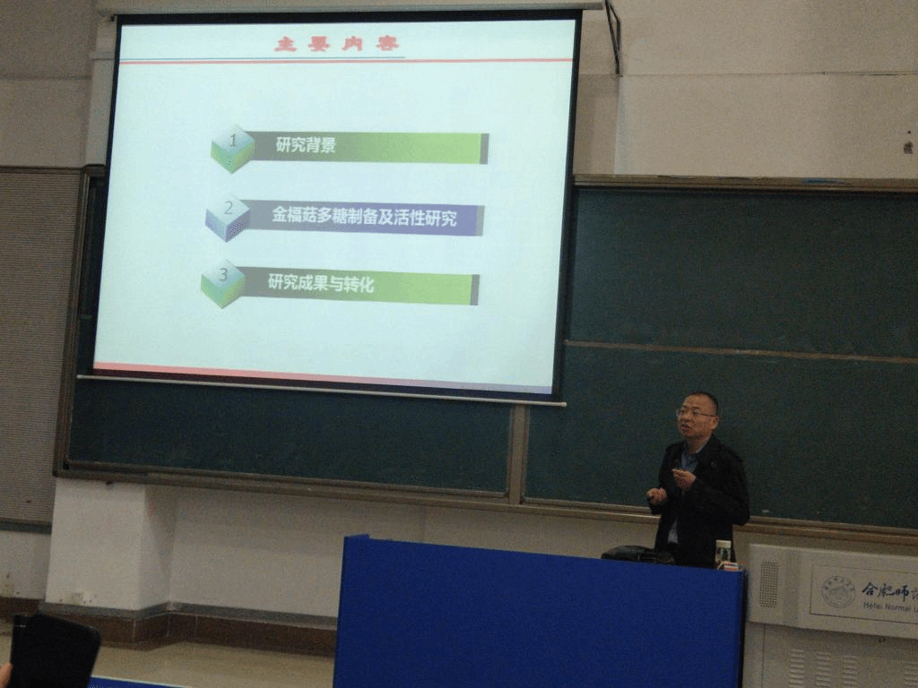 本网讯 11月18日下午,应生命科学学院邀请,安徽大学教授、博士生导师陈彦在逸夫楼西阶二教室,为生科院师生作了题为《金福菇多糖的高效制备与应用》的学术报告,生科院师生齐聚一堂聆听了报告,报告由生命科学学院经理徐忠东教授主持。