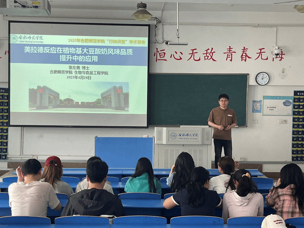 4月28日下午,122cc太阳成集团张左勇博士在锦绣校区逸夫楼A306教室作题为《美拉德反应在植物基大豆酸奶风味品质提升中的应用研究》行知讲座。学院副经理陈金武教授现场指导,食品质量与安全专业员工代表参加了此次报告。