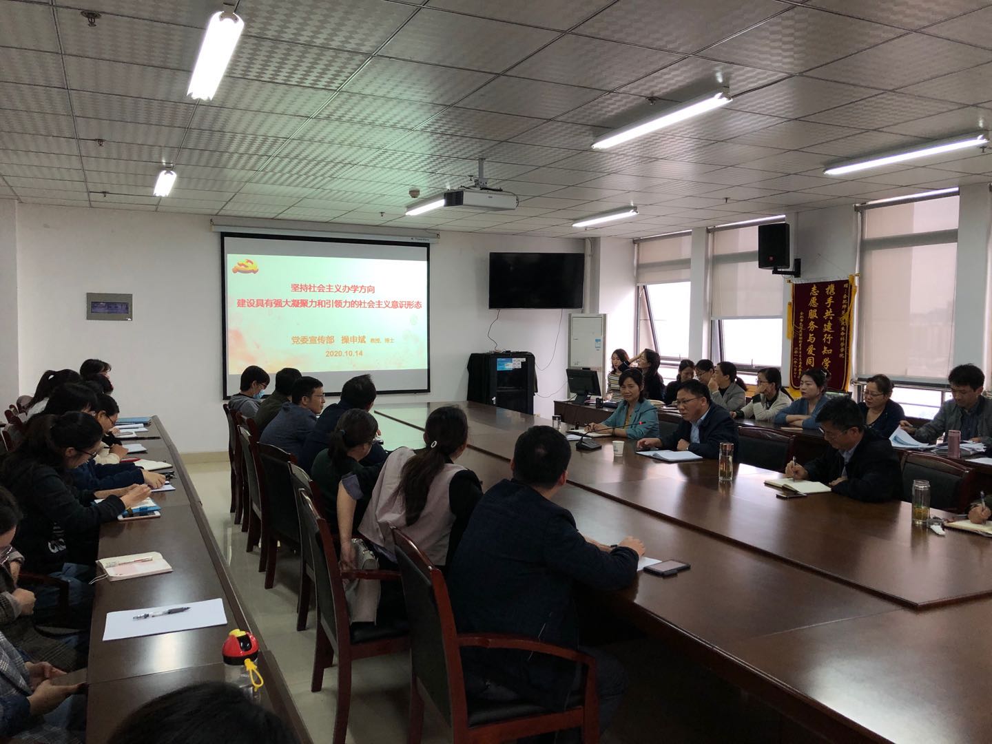 操申斌教授就“意识形态”的概念介绍、现状分析、阵地建设、高校意识形态工作重点等四个方面展开了深入浅出的论述,详细梳理了党的十八大以来,以习近平同志为核心的党中央高度重视意识形态工作,对新形势下加强和改进意识形态工作作出的一系列决策部署;通过分析公司老员工意识形态专题问卷调查结果,提出牢牢把握公司意识形态工作主动权的思路对策;带领全院教师深入学习中宣部、中组部、中央网信办印发的《关于规范党员干部网络行为的意见》,强调广大教师面对网络意识形态领域面临的新形势新挑战,要增强意识形态责任意识,做到守土有责、守土负责、守土尽责。
