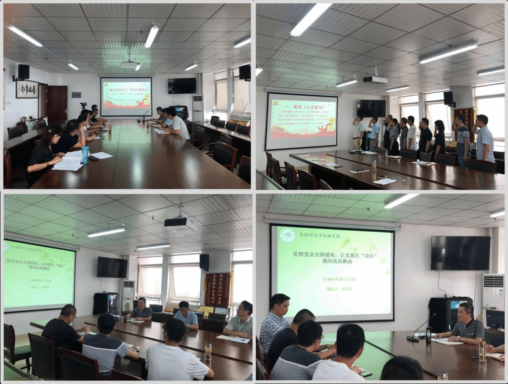 最后,支部全体党员讲述了战疫故事。徐忠东讲述了“生前带病连续战疫47天,原蚌埠市固镇县仲兴乡党委委员、纪委书记朱建波同志的光荣事迹”;王占军描述了家属作为普通医务工作者在疫情阶段甘于奉献的故事;王晶晶分享了援助武汉华中科技大学同济医学院医院队队员、中科大第一附属医院(安徽省立医院)陆卉护士长的英雄事迹;张雁叙述了“用砖头、板凳、草垛、棉被在山坡上搭建线上教学直播间”的安徽医科大学范新炯老师的故事;孙娴讲述了石河子市老党员张拉元主动请缨参加社区疫情防控的故事;朱勇分享了家属作为社区工作者“舍小家为大家”参与疫情防控的故事;施夏明介绍了退休老父亲两月未归、全身心义务服务社区防疫工作的故事;陈延松述说了“患癌抗疫女英雄”安徽省第三批援助湖北医疗队队员、安徽京东方医院主管护师周国红的英雄事迹;陶瑞松分享了亲属奋战抗疫一线为患者解除病痛、全心全意为患者服务的故事;沈章军讲述了家属“融入思政元素,打好线上战疫”的故事。