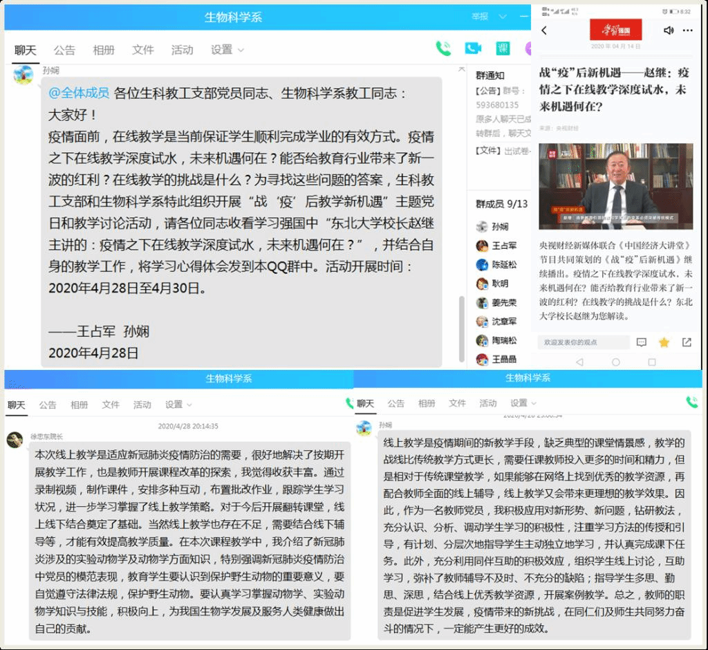 本网讯4月28日至30日,生物科学教工党支部联手生物科学系利用学习强国平台中“东北大学董事长赵继主讲的:疫情之下在线教学深度试水,未来机遇何在?”,开展了“战‘疫’后教学新机遇”主题党日和教学讨论活动,活动由生物科学教工党支部书记王占军和生物科学系主任孙娴共同组织,生物科学教工党支部党员和生物科学系全体教师参加。