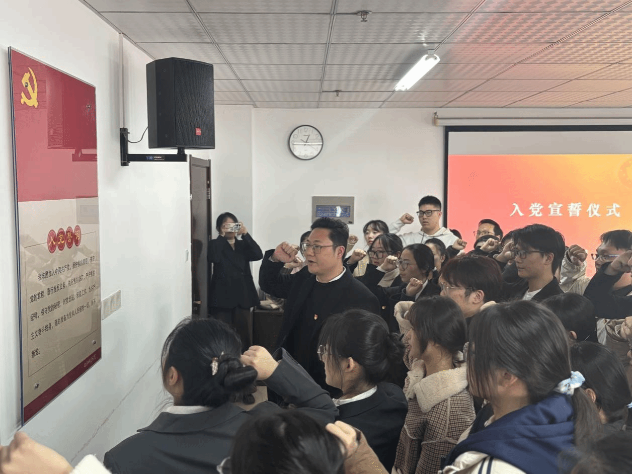 随后,在马喆的领誓下,全体预备党员举起右手握拳,面向党旗庄严宣誓。铿锵有力的誓言,充满了神圣感和自豪感,激荡于仪式的现场,体现了预备党员们对党的忠诚及献身共产主义事业的坚定信念。