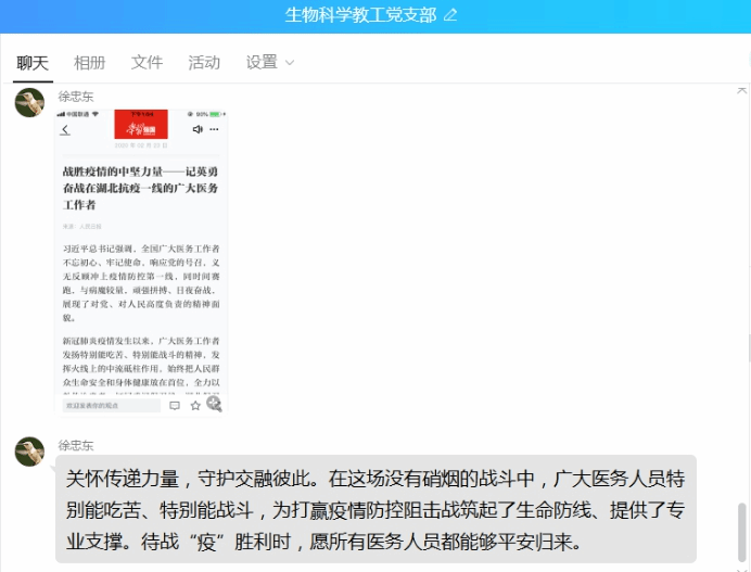 当前,疫情仍未完全控制,抗击疫情形势仍然十分严峻。支部全体教师纷纷表示:作为一名教育工作者要以“偶像”精神激励自己,引导员工保持健康、乐观的的心态,努力学习,回报社会;认真做好线上课程教学工作,结合专业知识帮助员工普及防疫措施;坚持主题学习和实践活动的常态化,不忘初心,牢记使命,用实际行动让党旗在防控疫情斗争中高高飘扬。(生命科学学院:王占军)