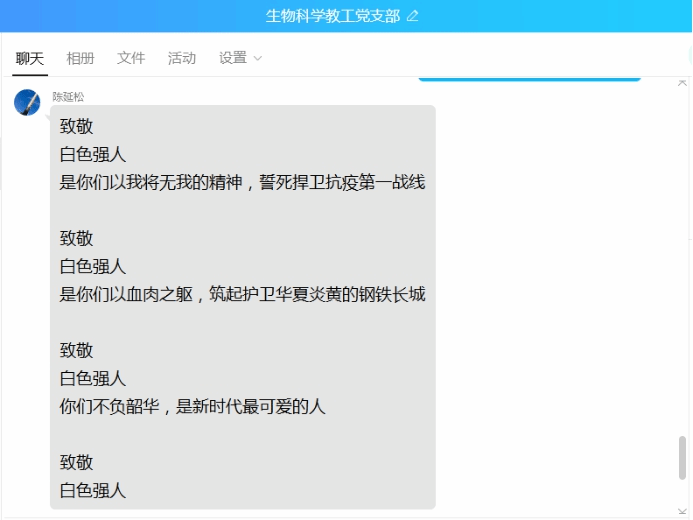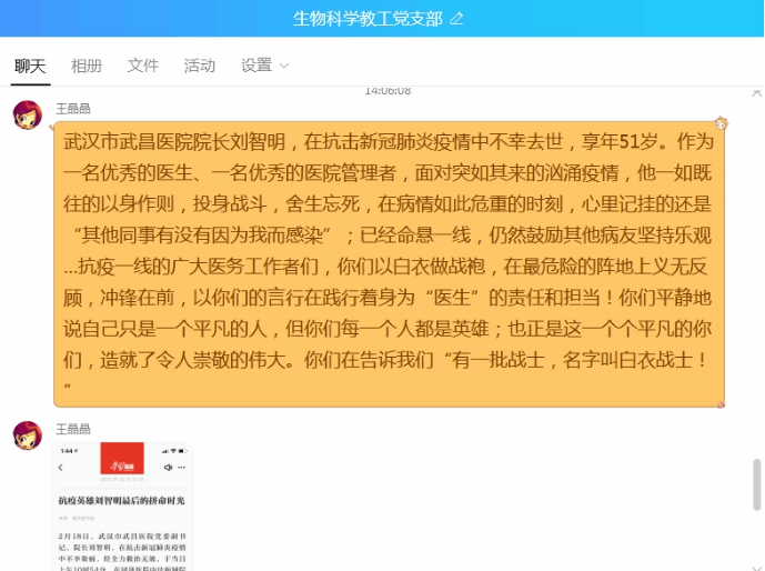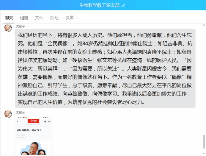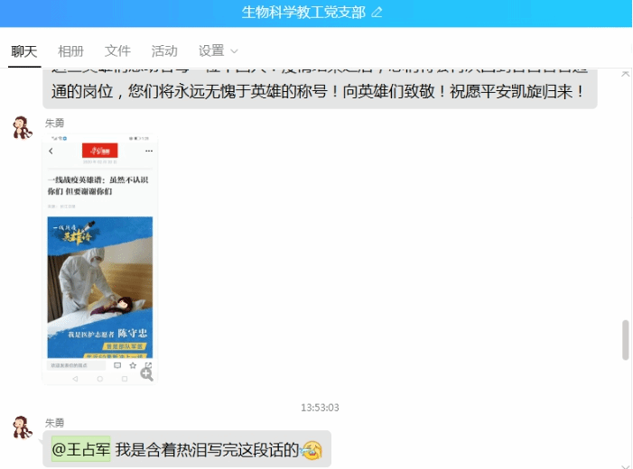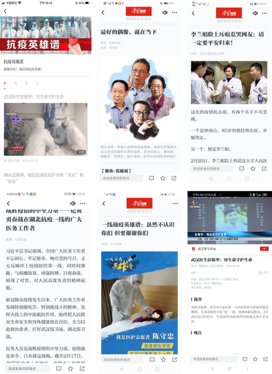 支部全体党员认真学习学习强国中的“抗疫英雄谱”,并积极分享了自己的学习心得:84岁仍然挂帅出征的钟南山院士,73岁力挽狂澜的李兰娟院士,冲锋在前的陈薇院士,武汉市武昌医院经理刘智明烈士,为抗击疫情推迟婚期的武汉市江夏区第一人民医院彭银华烈士,“硬核医生”复旦大学附属华山医院感染科主任张文宏医生,安徽医科大学附属巢湖医院ICU凌云护士长等一线的广大医务工作者们。