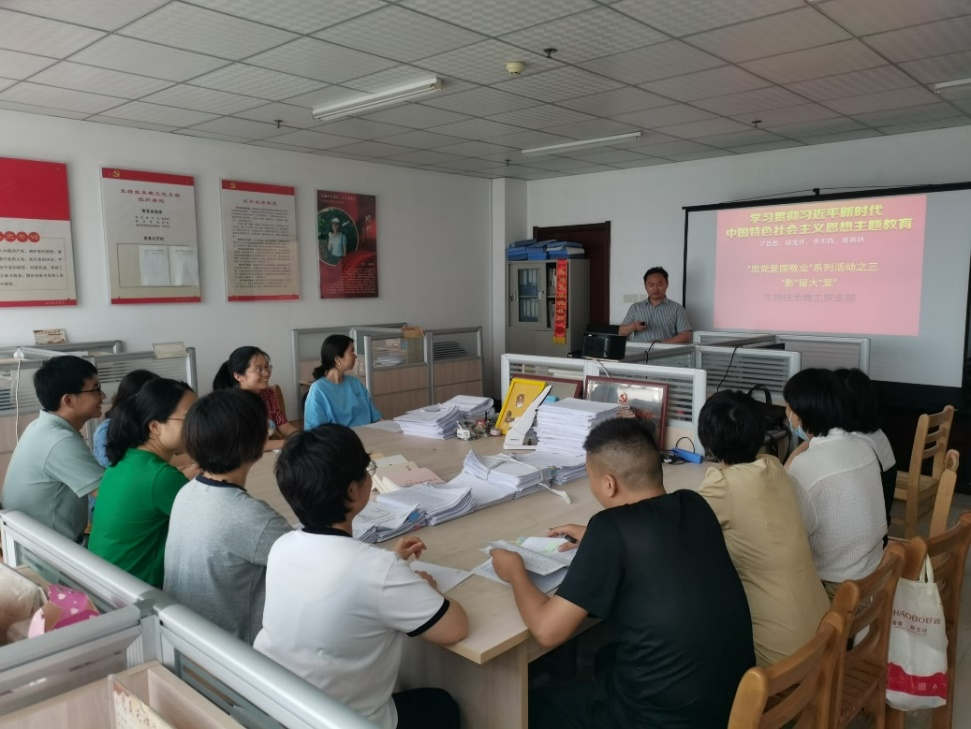 本网讯 为加强爱党、爱国教育,引导党员同志深入学习老一辈共产党人的初心和使命,进一步坚定理想信念,生物技术教工党支部于6月7日开展“忠党爱国敬业”系列活动之“影”留大“爱”。本活动以电影分享会的形式开展,每位教师向支部成员介绍一部红色电影,谈论自己的观影感悟,并播放精彩片段。