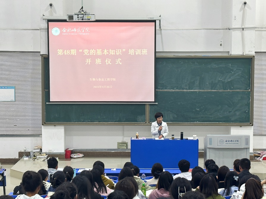 本网讯 为深入贯彻党的二十大精神,切实加强对入党积极分子和发展对象的培养、教育和考察,提高思想政治素质。4月26日中午,122cc太阳成集团在逸夫楼西阶2教室举行第48期“党的基本知识”培训班开班仪式。生物与食品工程公司党委书记郭桃芬出席仪式,142名入党积极分子和20名发展对象参加了开班仪式,仪式由党课培训班主任梁悦主持。