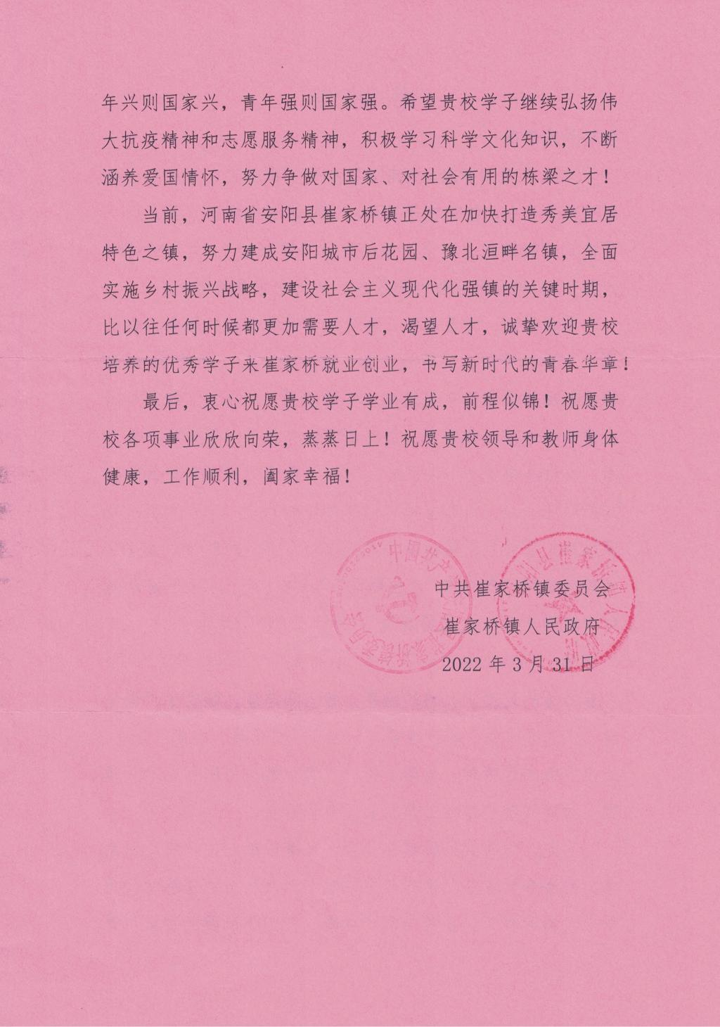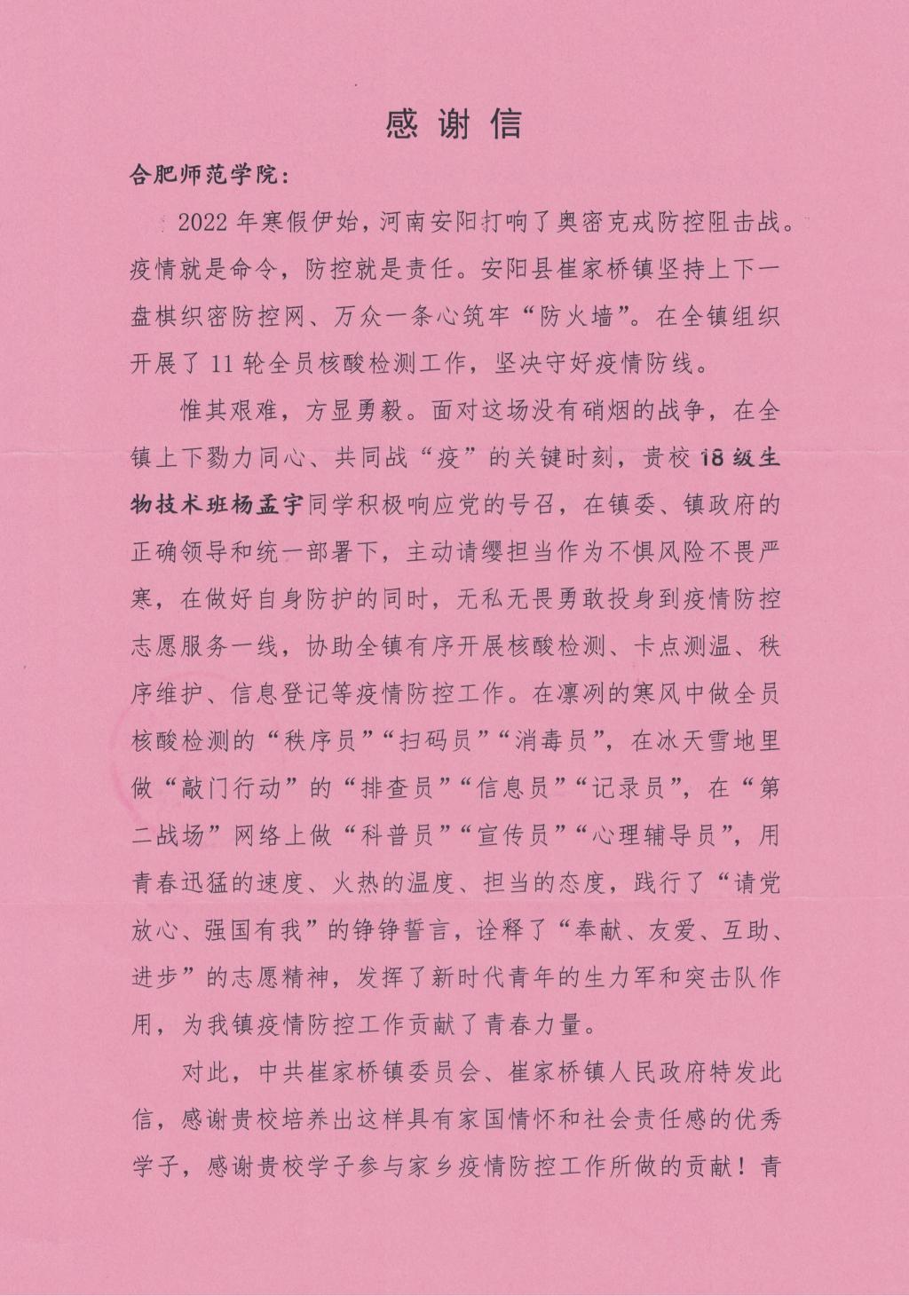 本网讯 近日,122cc太阳成集团生命科学学院收到了来自河南省安阳县崔家桥镇的感谢信。信中对18级生物技术班杨孟宇同学不畏艰险、奋勇向前,积极投身家乡的疫情防控志愿服务表达了诚挚的感谢和崇高的敬意。