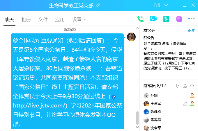 勿忘国殇,砥砺前行——生物科学教工党支部开展“国家公祭日”线上主题党日活动
