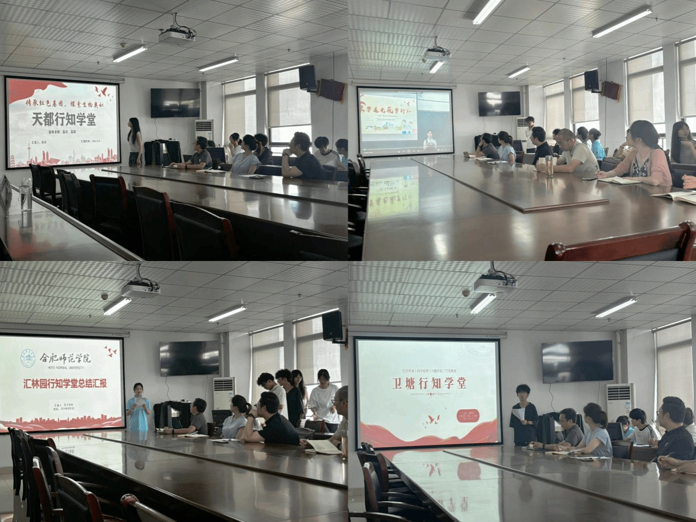 申报示范行知学堂的5个团队以PPT演示和现场解说的形式依次上台进行汇报。各团队从团队组建、学堂内容、特色亮点、学堂成效等方面全面展示了“行知学堂”实践活动开展情况及所见所闻、所思所悟、所得所获。