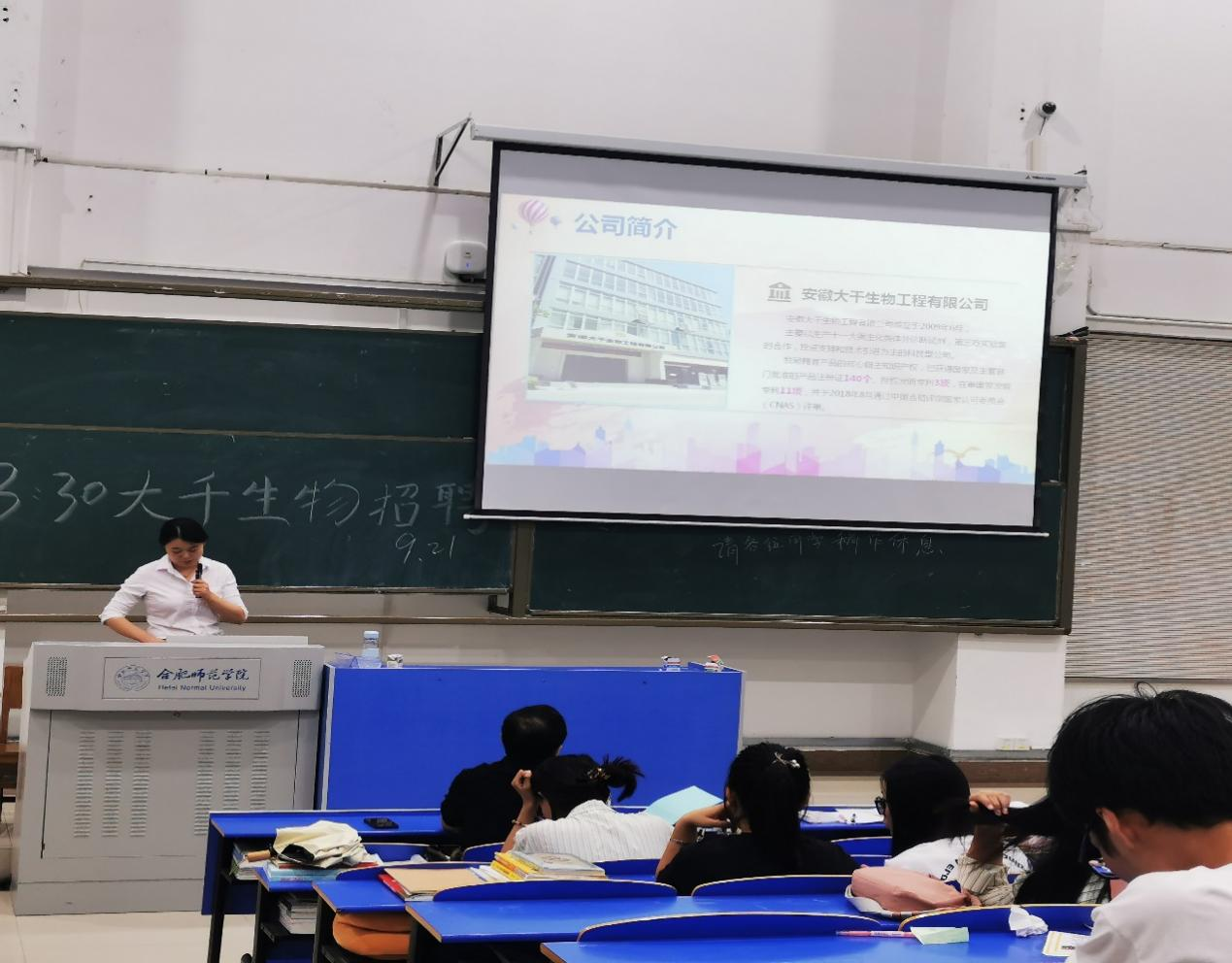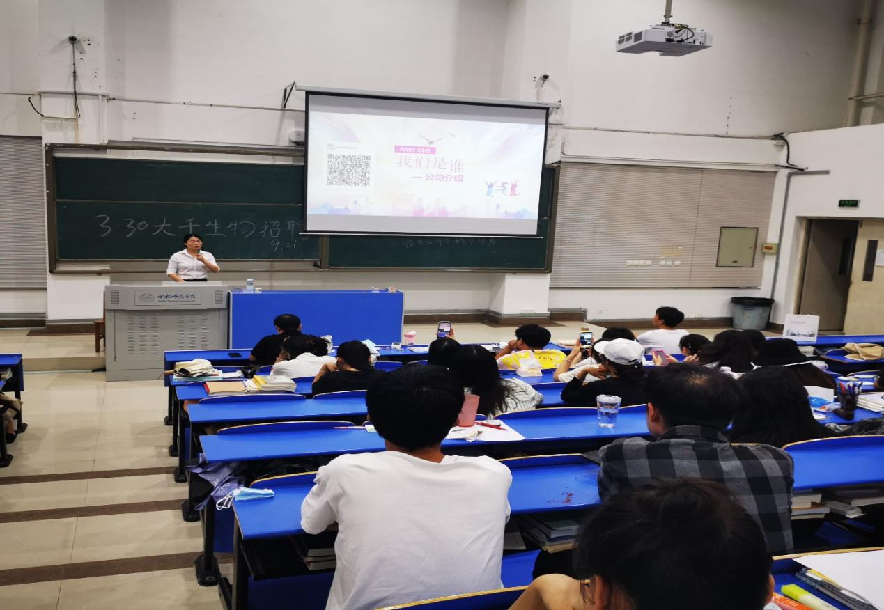 本网讯 为更好地拓宽毕业生就业渠道,大力构建毕业生与用人单位的交流平台,生命科学学院于9月21日下午在逸夫楼西阶一教室举行了安徽大千生物工程有限公司招聘宣讲会。生命科学公司党委副书记杨娜、实践教学部主任张雁、毕业班辅导员高欢出席了本次宣讲会。2023届生物技术、生物制药、生物科学专业的毕业生参加了招聘宣讲会。