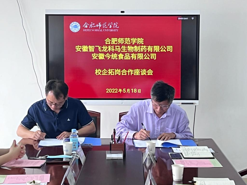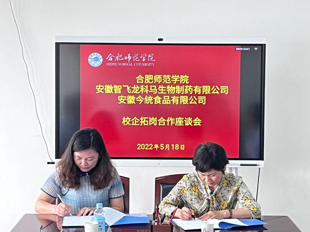 生命科学学院经理徐忠东、党委书记郭桃芬分别与智飞龙科马、今统食品共同签订毕业生就业实习基地合作协议。