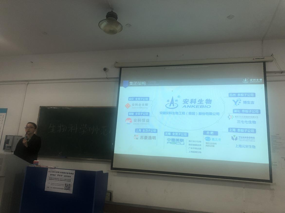 本网讯 为深入推进生命科学学院2022届毕业生就业工作,集中帮助毕业生解决就业工作中的问题困惑,生命科学学院于11月5日下午在逸夫楼A103举行了安科生物招聘宣讲会。生命科学公司党委副书记杨娜、生物技术支部书记、系主任陈金武、辅导员杨帆出席了本次宣讲会。生物技术、生物科学专业的部分毕业生参加了招聘宣讲会。