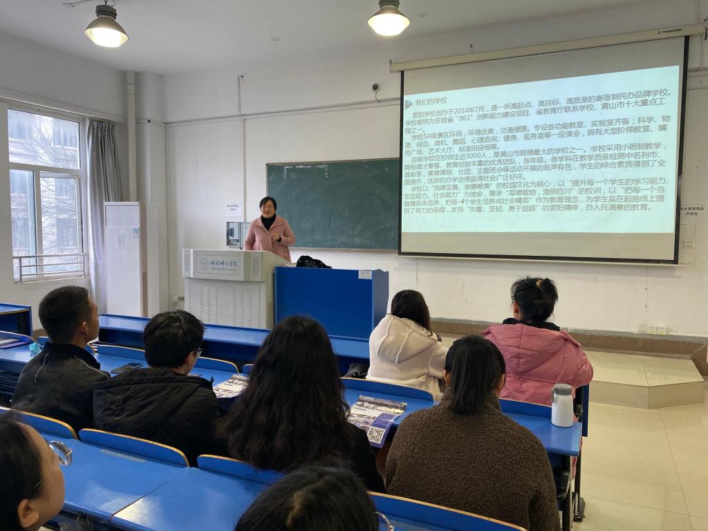 本网讯 为引导毕业生积极就业,帮助毕业生提供更多就业机会,3月11日下午,生命科学学院在逸夫楼203举办了“黄山紫阳学校”专场招聘宣讲会,招聘会由生命科学学院辅导员黄伟丽主持。
