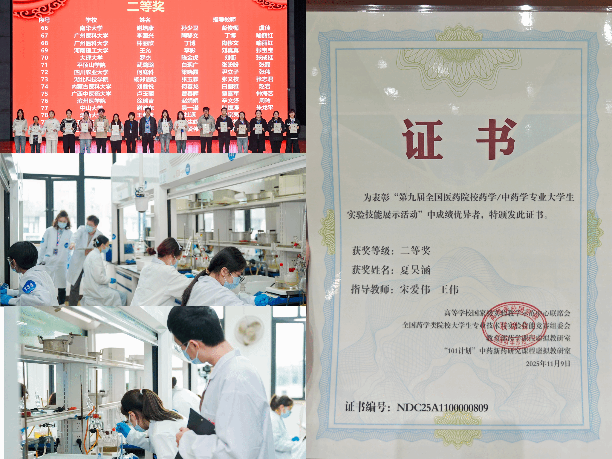 在全国性赛事中,23级生物制药班夏昊涵同学亮相于南京举办的“第九届全国医药院校药学/中药学专业老员工实验技能展示活动”。该赛事作为全国医药领域权威赛事,吸引了160多所高校900余名师生参与,竞争异常激烈。夏昊涵同学在理论考核与实验技能展示环节表现突出,最终斩获全国二等奖,实现了学校在该赛事参与奖项的双重突破。