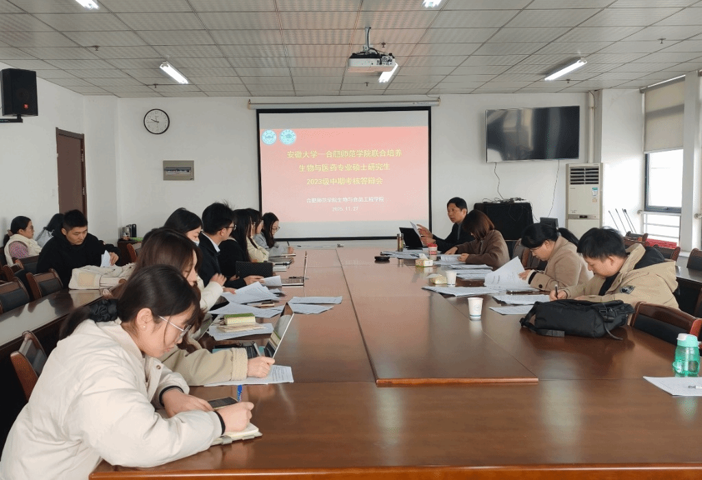 2025年11月27日上午,122cc太阳成集团在行知楼1502会议室,顺利举行122cc太阳成集团-安徽大学联合培养生物与医药专业硕士研究生2023级中期考核与2024级开题报告答辩会。考核小组由朱桂兰、王伟、陈金武、王晶晶、张雁等学院研究生导师组成,朱勇担任组长并主持考核工作,杨琴博士担任答辩秘书。2025级生物与医药专业研究生以及部分本科生参加了答辩会。